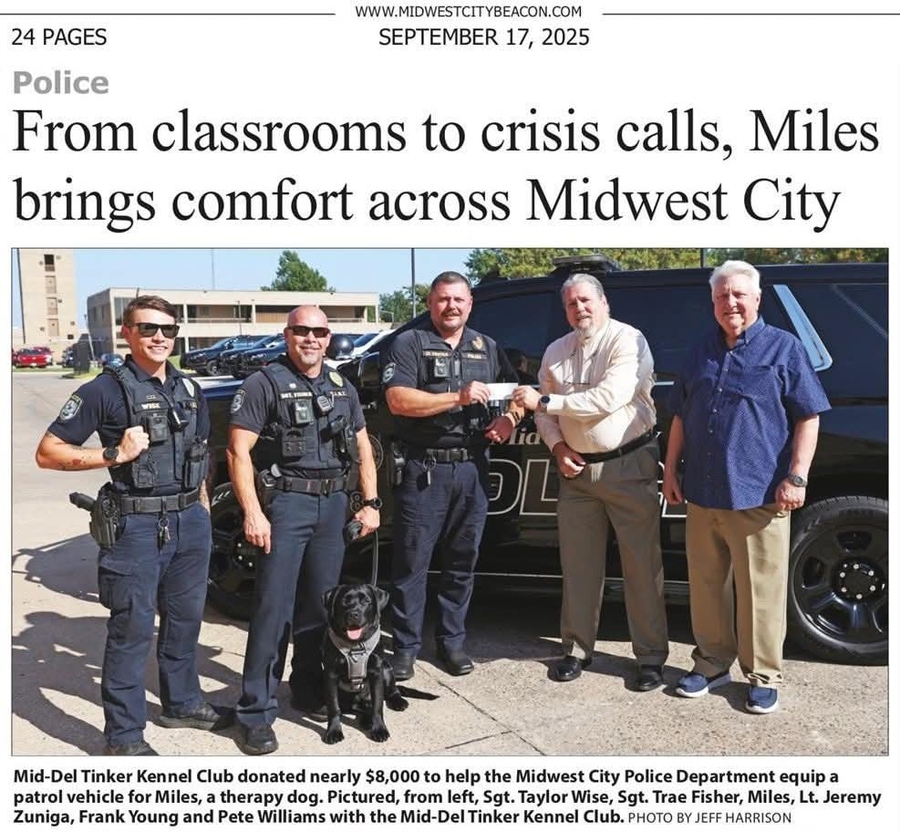 Frank is the First Past President of the Mid-Del-Tinker Kennel Club and is an active Member at Large of their Board of Directors. He has also served on the Park and Recreation Board and the Police Community Advisory Board. He currently serves on the Board of Adjustments. He is an active member in good standing of the Heartland Chapter of the Air Force Security Forces Association.